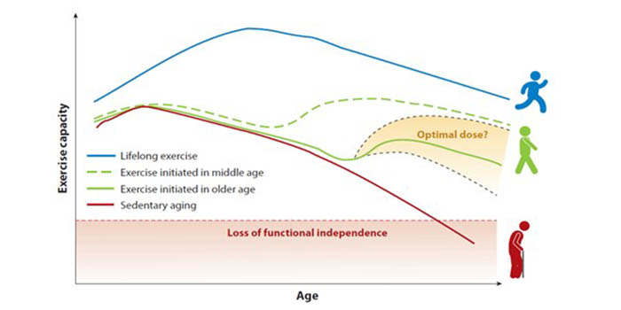 - Por último, la línea roja recoge datos de personas que hicieron poca actividad física en su niñez y juventud, y además fueron sedentarias a lo largo de su vida. Se puede observar cómo esas personas rebasan la línea de capacidad funcional (línea roja discontinua) y se convierten en personas dependientes en su madurez. Esto significa que para el desempeño de sus actividades cotidianas necesitan la ayuda de terceros y además, han dejado de hacer aquellas actividades que podían hacer cuando eran más jóvenes.