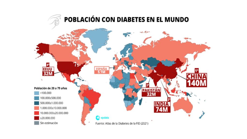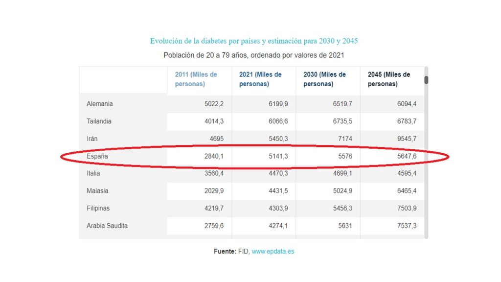 En España el número de casos de diabéticos en los últimos diez años casi se ha duplicado de 2840 casos en 2011 a 5141 casos en 2021 y se prevé que la cifra se siga incrementando en los próximos años. (fuente FID epdata.es)